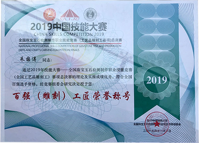 2019年中国技能大赛荣获百强(雕刻)工匠荣誉称号