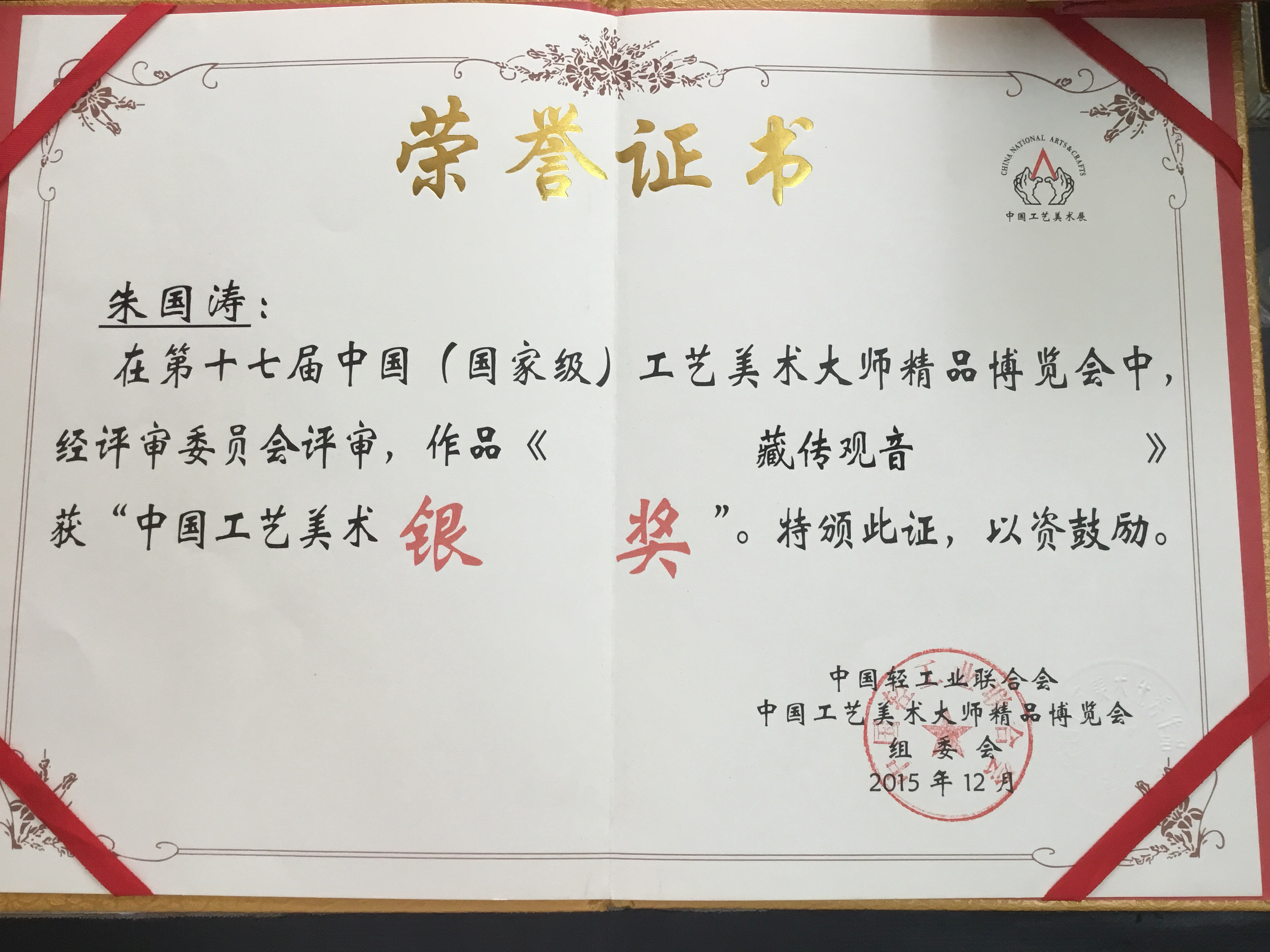 观音荣获2015中国工艺美术“百花奖”银奖
