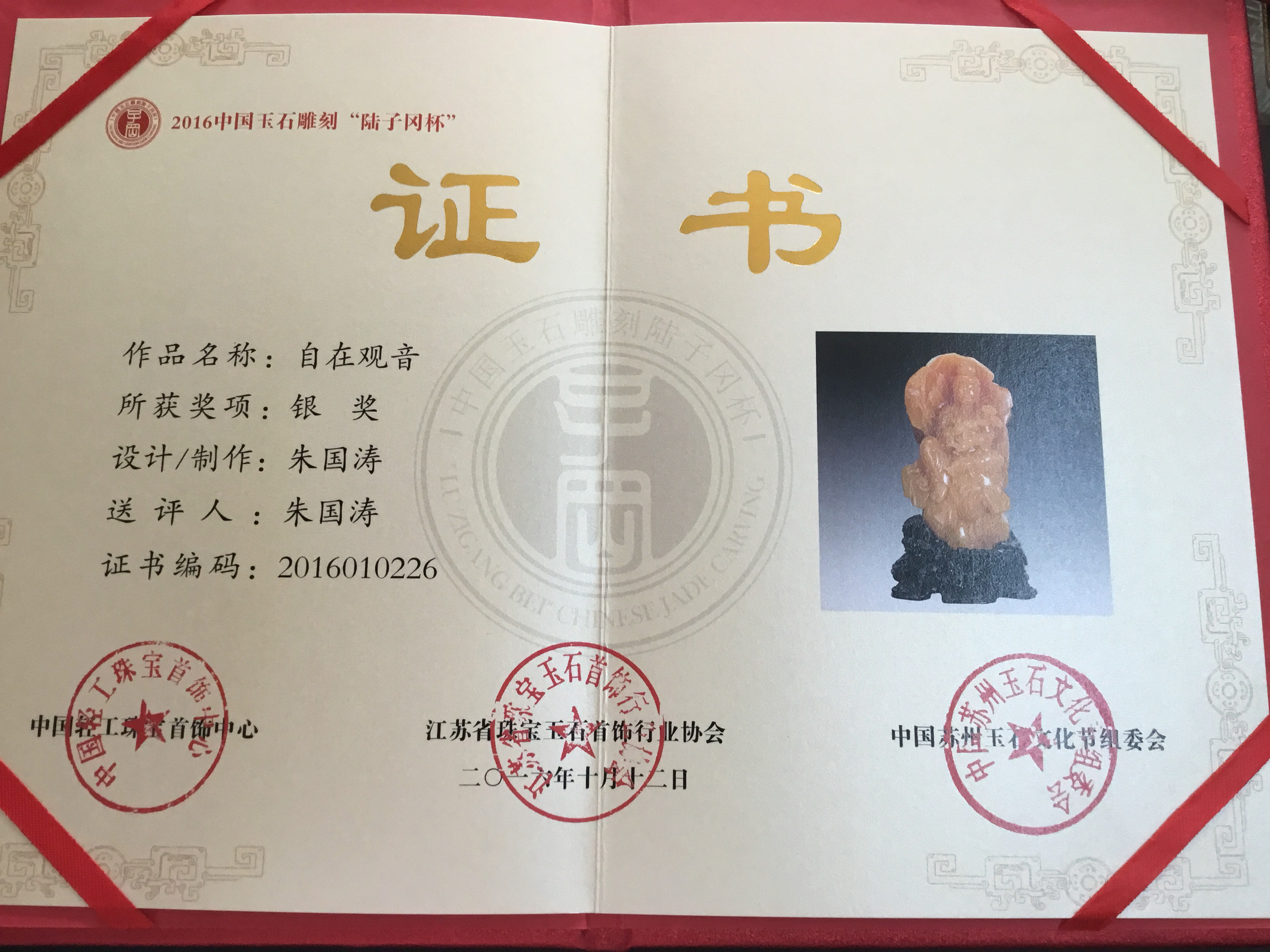 2016年《自在观音》获得中国玉石雕刻“陆子冈杯”...